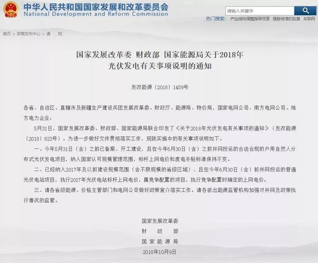 紧接着在10月9日,国家发改委发布了《关于2018年光伏发电有关事项说明的通知》,明确今年5月31日(含)之前已备案、开工建设,且在今年6月30日(含)之前并网投运的合法合规的户用自然人分布式光伏发电项目,纳入国家认可规模管理范围。分析认为,这则《通知》进一步说明,国家发改委等部委仍保持着政策的连续性,一定程度上也恢复和提振了市场信心,让投资者对2019年的分布式市场充满了期待。