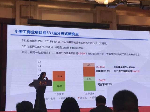 王淑娟认为,“531”政策执行后,影响范围很大,波及最大的是户用分布式光伏的发展,很多项目陷入了停滞状态。不过在三季度,分布式的装机量为4.9GW,这个数据非常出乎人的意料。与2016年全年分布式装机4.12GW、2017年三季度新增3.06GW的数据相比,在已知无补贴的情况下,能够做到新增4.9GW的成绩,可见大家依然对分布式发展的积极性。