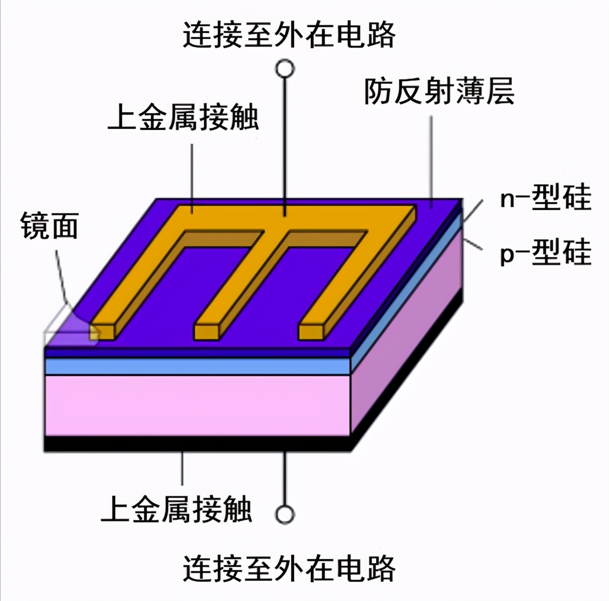 具体原理上,光伏就是利用太阳能光伏效应,借助太阳能电池(光伏电池)将太阳光转换成电能。典型的太阳能电池用掺杂之后的p型硅和n-型硅连接在一起,形成pn结,放置在上、下两个金属接触层之间。上金属接触是格子状的,以容许光线射入。在pn结的顶部有一层防反射薄层,以减低从光亮的硅表面反射出来的光线。更详细的技术比较复杂,也很枯燥,就不展开了。