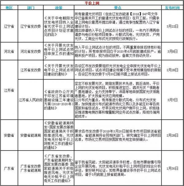 响应国家关于平价上网有关工作的通知,各省的平价上网工作正在紧锣密鼓地开展中。继上月山西、陕西等省份启动平价上网试点上报工作之外,本月广东、安徽、江苏、河北相继出台申报通知,最晚上报时间为3月20日-3月底,具体可在下述政策表格中查询。