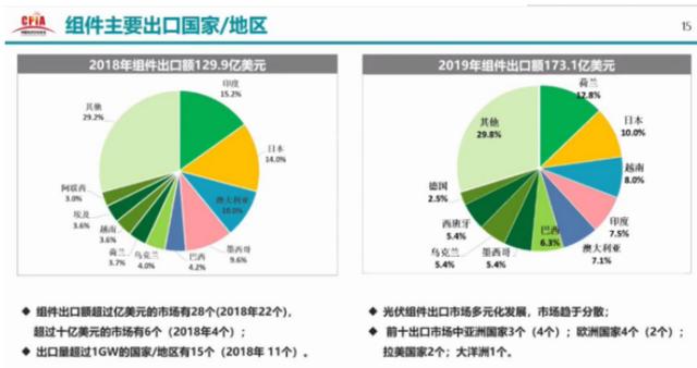 从整体的出口额来看,当2011年出口额在221亿美元的时候,组件大约出口了20GW左右。但是,2019年出口额在207.8亿美元的时候,组件出口量超过了65GW,出口增速非常快。2019年,组件整体出口额在173.1亿美元,超过了2018年硅片、电池片、组件这三个环节的全年出口的总额。