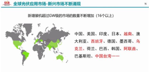 从全球光伏的应用市场来看,新增装机超过GW的市场数量仍然在不断的增加,如越南、西班牙等等,说明新兴市场在不断的涌现。