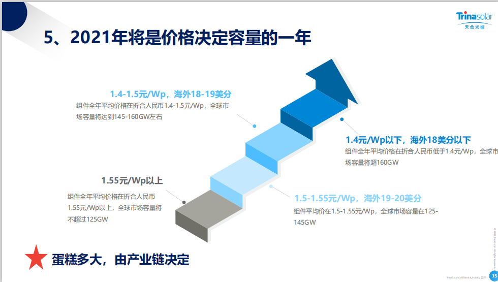 市场规模和组件价格,好比跷跷板的两端,总有一个在下面!如果预期较高的市场规模,就不能有很高的组件价格。在此,用天合光能的一页PPT阐述市场与规模的关系。说明:图片中的价格为不含运费的价格,实际价格要加上4~10分/W的运费。