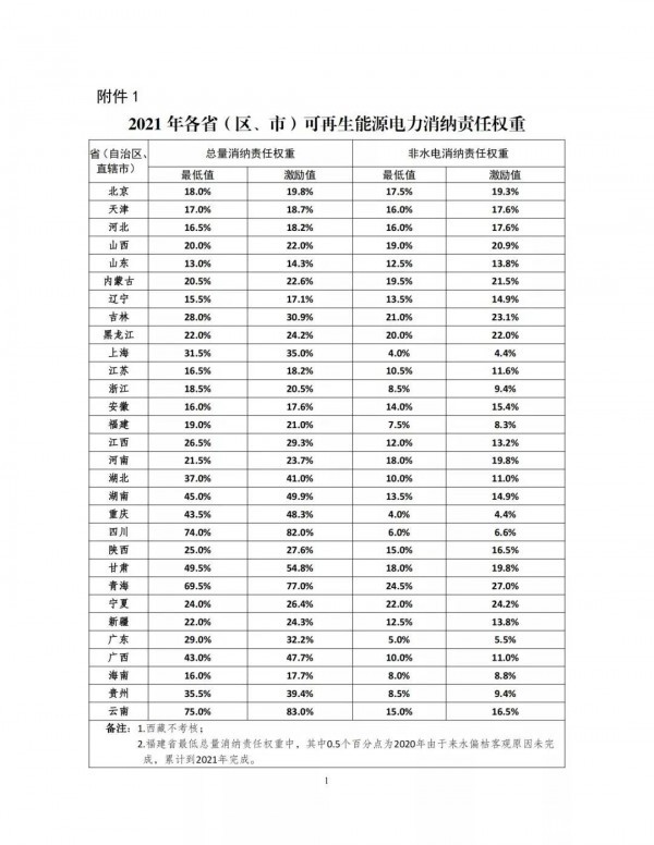 附件:1.2021年各省(区、市)可再生能源电力消纳责任权重