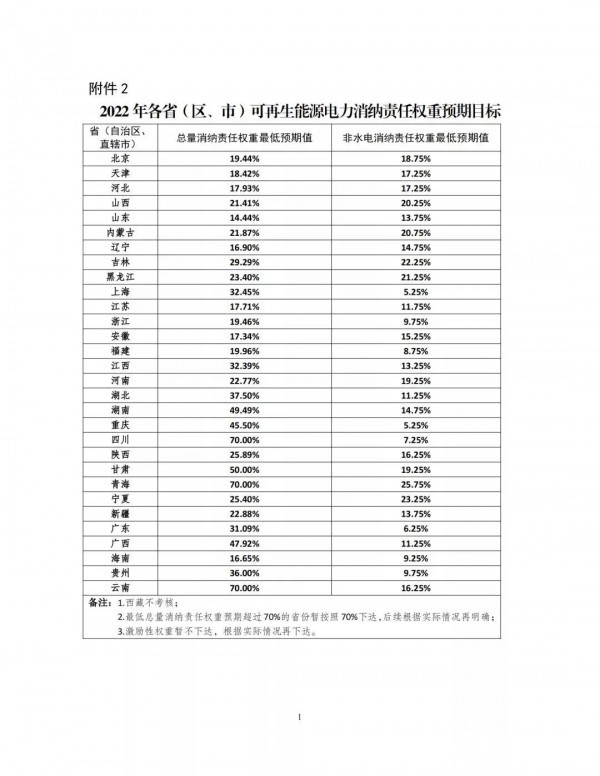 一、从2021年起,每年初滚动发布各省权重,同时印发当年和次年消纳责任权重,当年权重为约束性指标,各省按此进行考核评估,次年权重为预期性指标,各省按此开展项目储备。2021年各省(区、市)消纳责任权重见附件1,2022年各省(区、市)预期目标见附件2。