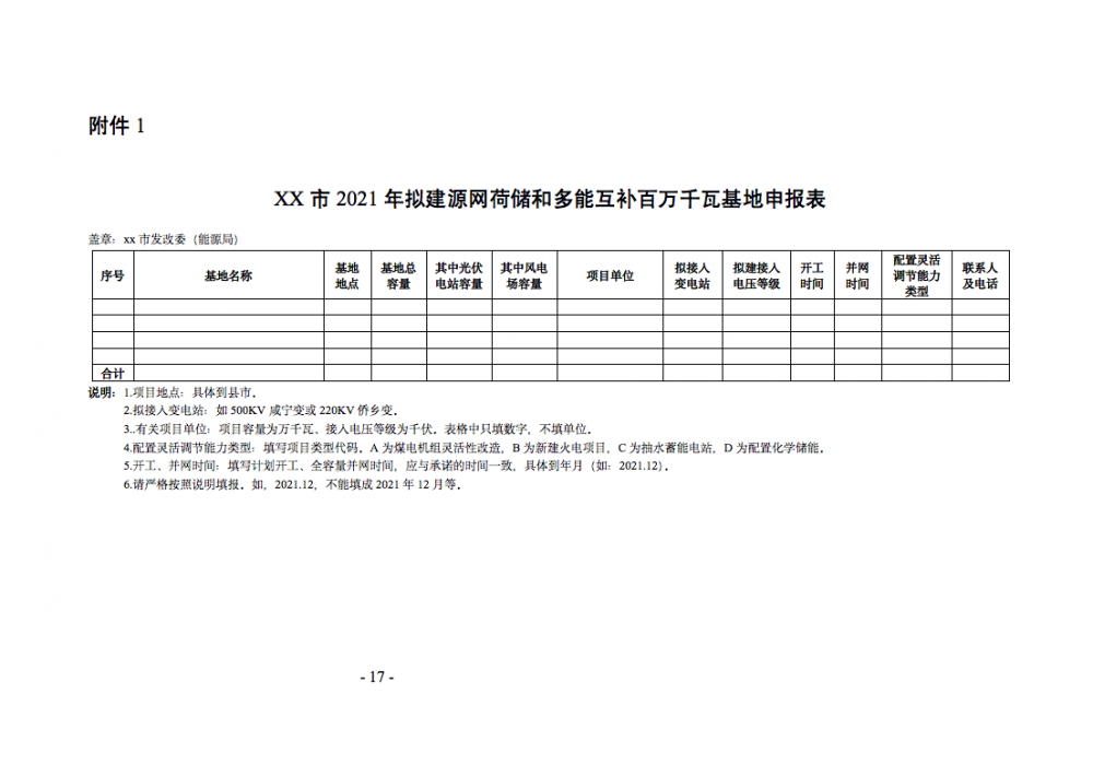 附件:1.XX市2021年拟建源网荷储和多能互补百万千瓦基地申报表