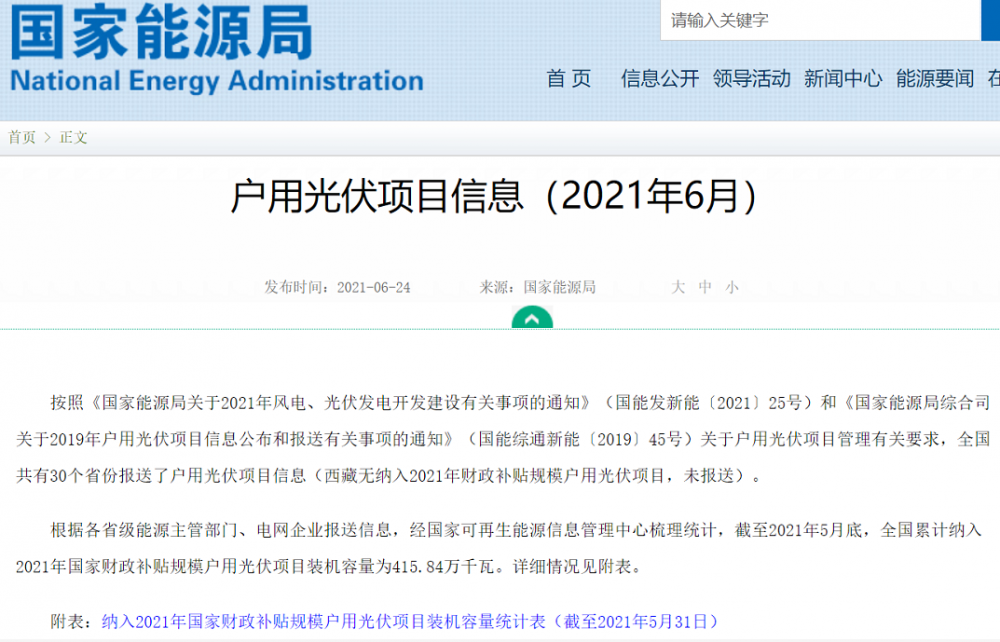 国家能源局发布《户用光伏项目信息(2021年6月)》。