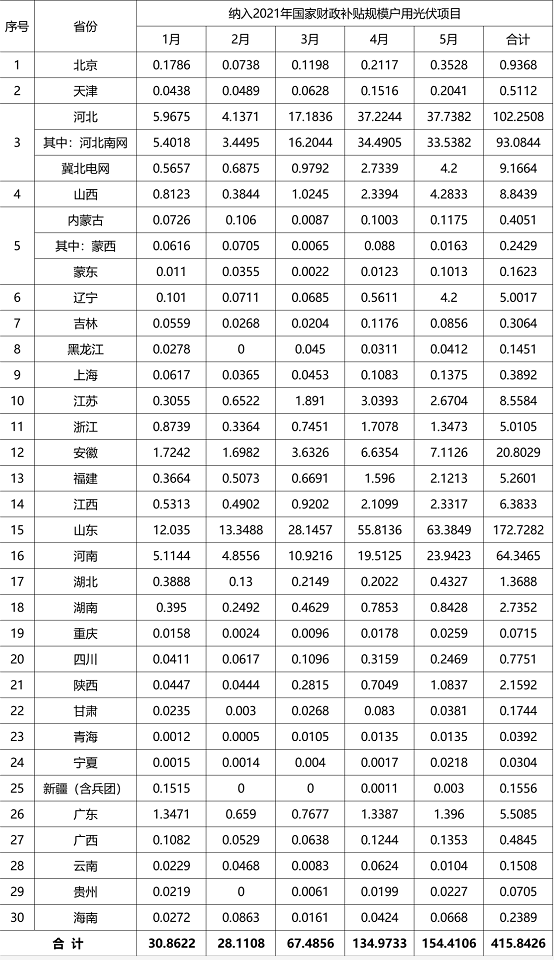 根据各省级能源主管部门、电网企业报送信息,经国家可再生能源信息管理中心梳理统计,截至2021年5月底,全国累计纳入2021年国家财政补贴规模户用光伏项目装机容量为415.84万千瓦。