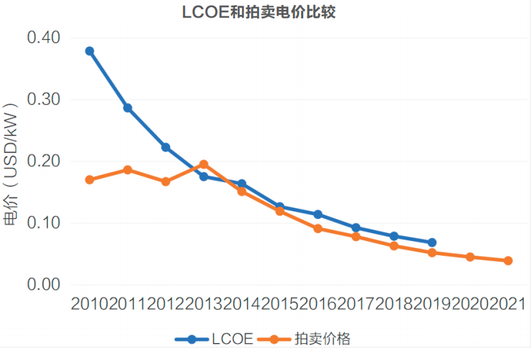 四是引入竞拍机制。政府或者国有电网公司通过合理的竞标机制,从项目方案及技术先进性、前期工作深度、申报电价等各个方面评选出符合要求且成本最低的项目开发商。充分的竞争使得电价更贴切反应市场水平,满足开发商投资回报的同时也能降低社会用电成本,达成双赢。竞拍机制负荷行业的普遍共识,实施竞标机制更有利于可再生能源行业的长久稳定发展。目前部分发展中国家已经引入这一机制,如非洲的南非、乌干达、赞比亚和拉丁美洲的巴西、墨西哥等。上图中可以看出拍卖电价较LCOE明显低,拍卖机制更具竞争力。