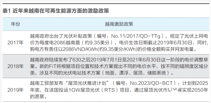 但是同为发展中国家,越南仅在9年内就缩小了这一差距。2019年越南太阳能发电装机容量激增至5.4GW,风电增加300MW。可以说,越南对于可再生能源的激励政策功不可没。表1具体列举了近年来越南在可再生能源方面的激励政策。