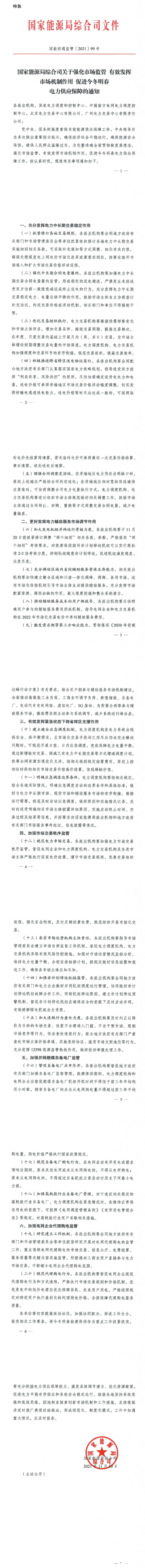 11月10日,国家能源局综合司发布特急通知,要求强化市场监管、发挥市场机制、促进电力供应保障。