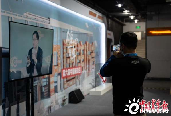 2021年12月26日,北京,第六届“中国制造日”活动现场,会场内圆桌论坛正在进行,一位工作人员用手机拍摄“中国制造日”宣传板留念。