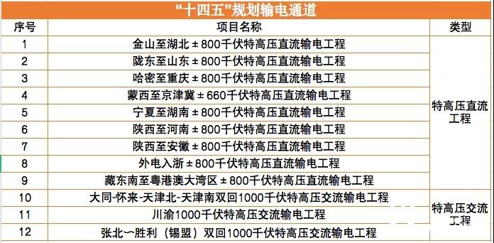 除上述12条特高压外,结合可再生能源规划以及送端区域的可再生能源资源禀赋和建设条件,“十四五”期间,仍将新增输电通道以及配套电源规模。