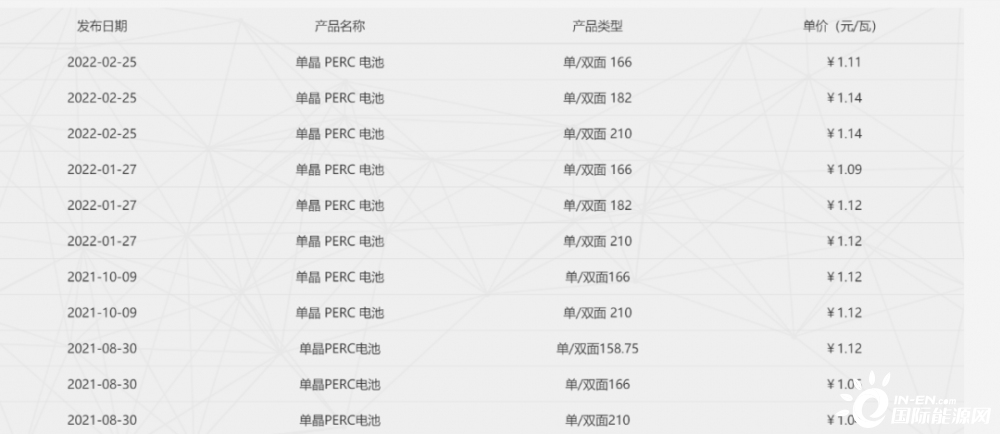 通威太阳能于今天宣布了最新一期的价格走势,其中166、182和210产品全面调价。目前报价分别是1.11元每瓦、1.14元每瓦、1.14元每瓦。相比1月27日的1.09元每瓦、1.12元每瓦、1.12元每瓦分别微幅上涨2分钱。涨幅在1.178%到1.83%之间。
