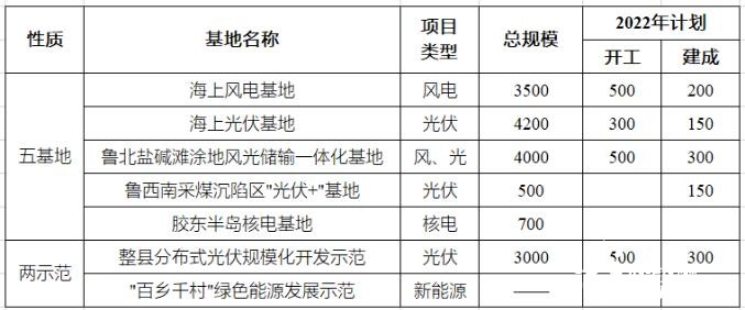 3月3日,山东省能源局印发《2022年全省能源工作指导意见的通知》中,提出“五基地二示范”的概念,各项工程规模规划如下表所示。