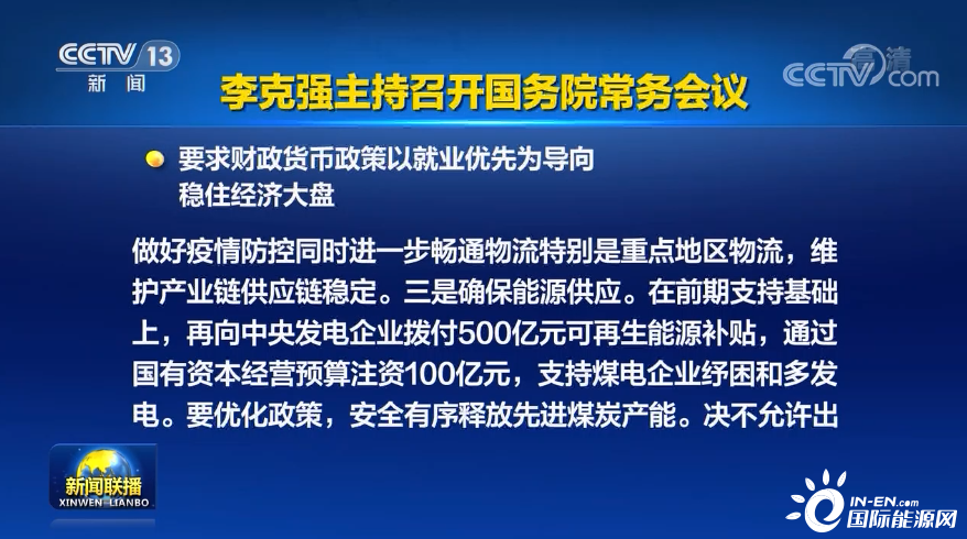 确保能源供应。在前期支持基础上,再向中央发电企业拨付500亿元可再生能源补贴,通过国有资本经营预算注资100亿元,支持煤电企业纾困和多发电。据企业反馈:此次为第二批500亿补贴。