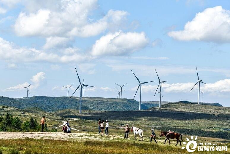游客在贵州省龙里县龙里大草原的风电场观光 杨文斌 摄