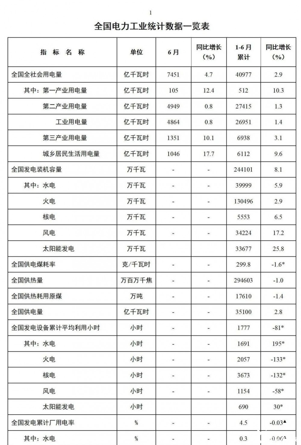 1-6月份,全国发电设备累计平均利用1777小时,比上年同期减少81小时。其中,火电2057小时,比上年同期减少133小时;核电3673小时,比上年同期减少132小时;风电1154小时,比上年同期减少58小时。