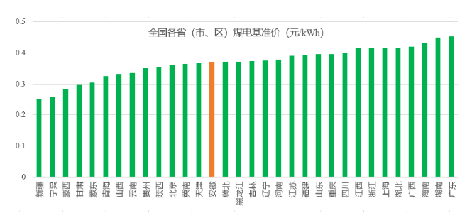 当前,我国各省的煤电基准价如下图所示,平均值为0.3692元/kWh(安徽省为0.3693元/kWh,最接近平均值,可作为标准参考)。