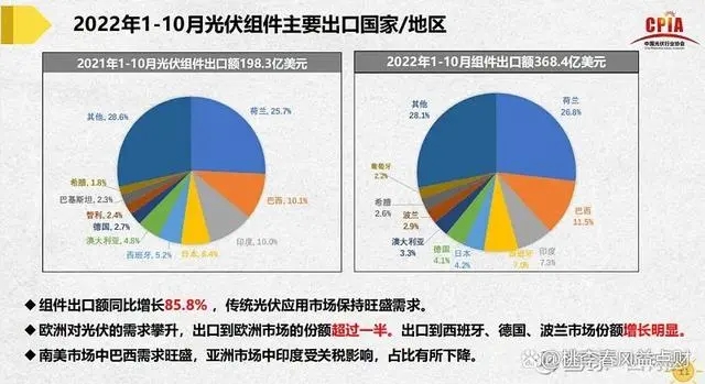 以上是此次光伏行业协会年会的数据,荷兰作为全球最大的光伏组件中转基地,依然榜首。其次是巴西,作为北美和南美的重要中转港口。