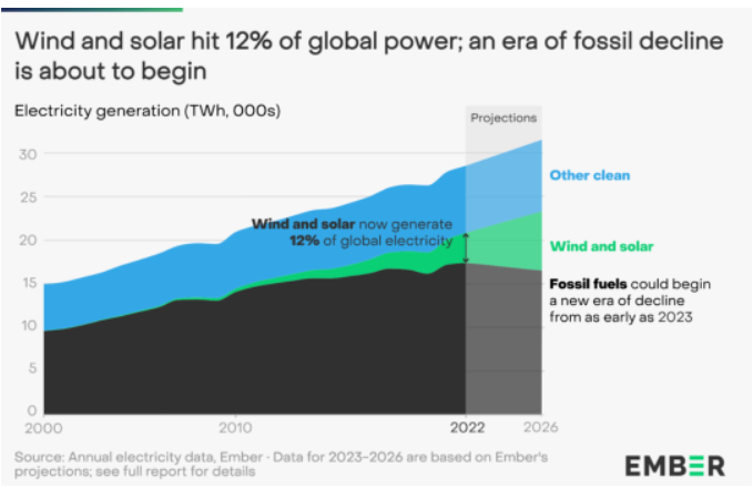 风电和太阳能在全球电力中占比达12%,化石燃料下行时代将启动