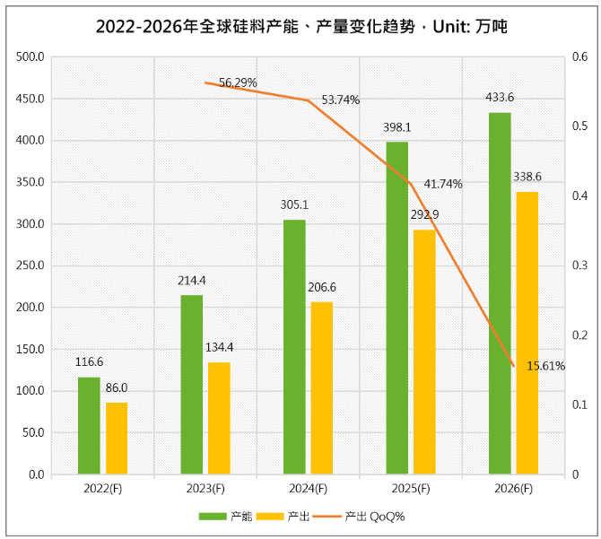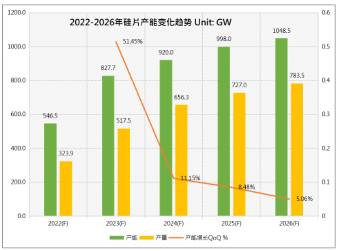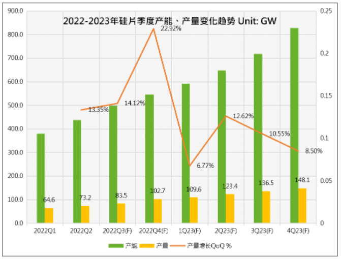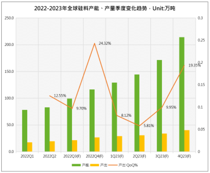 2022年,在光伏行业高景气的背景下,多晶硅生产企业不断扩大产能,2022年下半年起多晶硅产能开始加速释放,集邦咨询旗下新能源研究中心预测,2023年底多晶硅总产能将达到214万吨,同比增长82.9%;2023年随着各大硅料龙头厂商和众多新玩家的产能的陆续释放,硅料将不再成为产业链发展的瓶颈环节,硅料整体供应充足,且逐渐出现过剩的情况。2023年硅料全年产出约134万吨,同比增幅高达56.29%,可支撑超过500GW的组件产出,较2023年330-350GW的装机预测明显过剩。硅料供大于求,价格将进入下行通道,光伏产业链价格有望回归合理水平。
