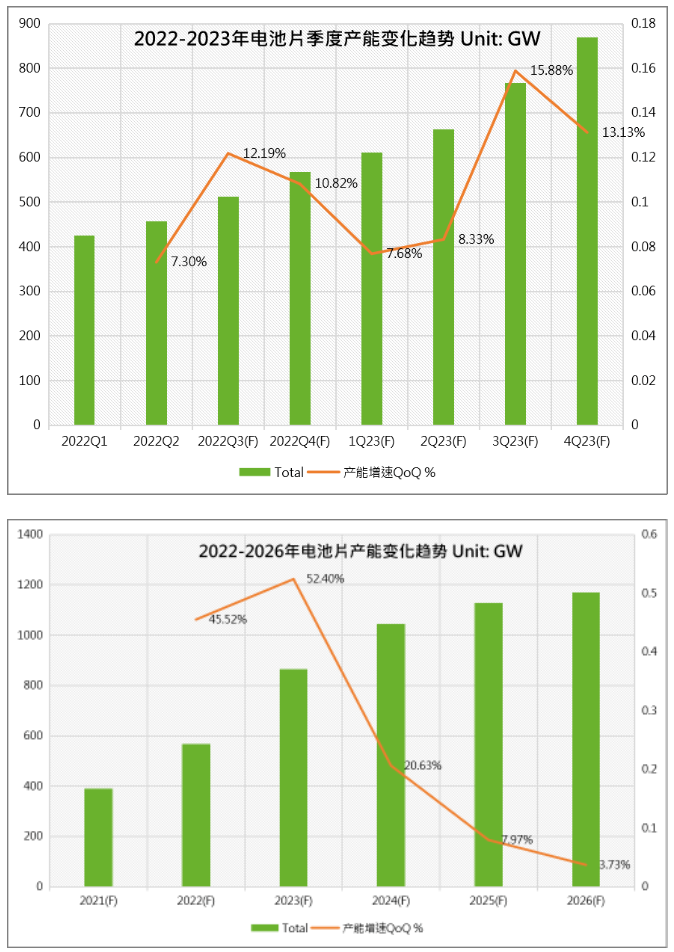 当前,PERC面临提效瓶颈,光伏行业逐步进入“N型时代”,以TOPCon、HJT、XBC为代表的N型技术逐渐成为企业争相布局的焦点。未来随着生产成本的降低及良率的提升,N型电池有望超越P型电池成为主流。2023年电池片产能将继续快速扩张,N型电池片占比持续提升。集邦咨询预测,2023年电池片总产能将达到886GW,同比增长52.4%,其中N型电池片产能约338GW,占比39%,产能份额快速提升。