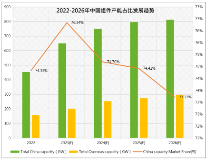 2023年在政策引导和市场需求的双轮驱动下,全球光伏装机需求持续旺盛,组件产能持续扩张。集邦咨询预测,2023年全球组件产能可达853GW,同比增长39.3%;新增产能达240GW,产能扩张仍以中国企业为主,预计2023年中国组件产能占比将达到76.34%。