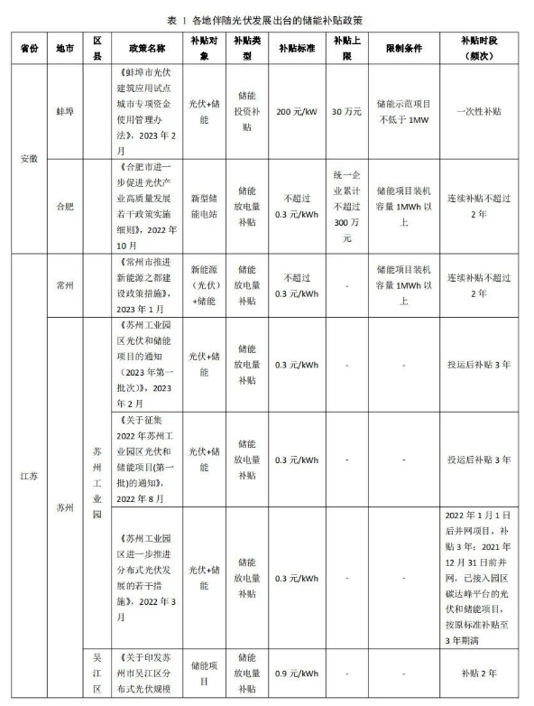 为保障新能源高效利用消纳,提升新能源并网友好性和容量支撑能力是电源侧储能的主要作用。除国家层面外,各省也在加快光储融合工作。目前,全国已有超过二十个省份发布了鼓励或强制新能源配置储能的政策,以江苏、浙江、安徽、广东等区域为代表,结合光伏产业发展,出台了多项“光伏+储能”的补贴政策,其中,“分布式光伏+储能”项目及“光伏场站+储能”项目均在激励范围内。