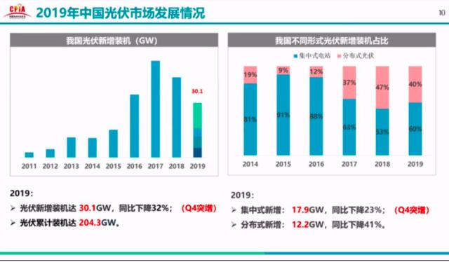 值得注意的是,在2019的新增装机中,第四季度的抢装占据近半。王勃华介绍,第四季度突增14GW多,其中10GW多是集中式光伏电站。