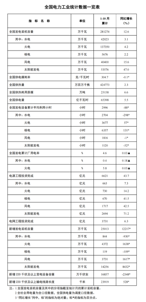 截至10月底,全国累计发电装机容量约28.1亿千瓦,同比增长12.6%。其中,太阳能发电装机容量约5.4亿千瓦,同比增长47.0%;风电装机容量约4.0亿千瓦,同比增长15.6%。